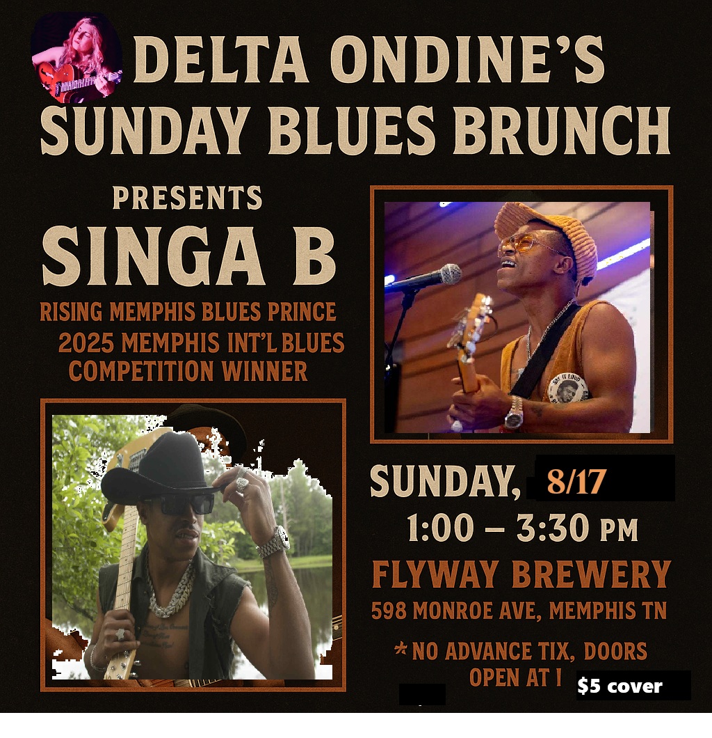 Host and opening act, for Mr. Robert Kimbrough Sr, Delta Ondine’s Sunday Blues Brunch, Flyway Brewery, 598 Monroe Ave., Memphis TN